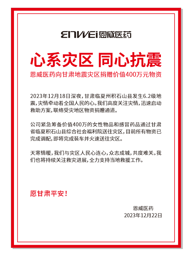 12月18日(ri)23時59分,甘肅(su)臨夏(xia)州積石山(shan)縣發生(sheng)6.2級地(di)震,造成(cheng)人(ren)(ren)員傷亡以及(ji)基(ji)礎(chu)設施(shi)受(shou)損。災(zai)情牽動了全(quan)國人(ren)(ren)民(min)的(de)心(xin),作為一(yi)家有(you)社(she)(she)會責任(ren)感的(de)企業,恩(en)威醫藥第一(yi)時間響應,調配物資(zi),通過甘肅(su)省臨夏(xia)積石山(shan)縣綜合社(she)(she)會福利院向災(zai)區捐(juan)贈價值(zhi)400萬余元藥品及(ji)女性用品,用于抗(kang)震救災(zai),以實際行動支援(yuan)地(di)震災(zai)區人(ren)(ren)民(min)渡過難關(guan)。